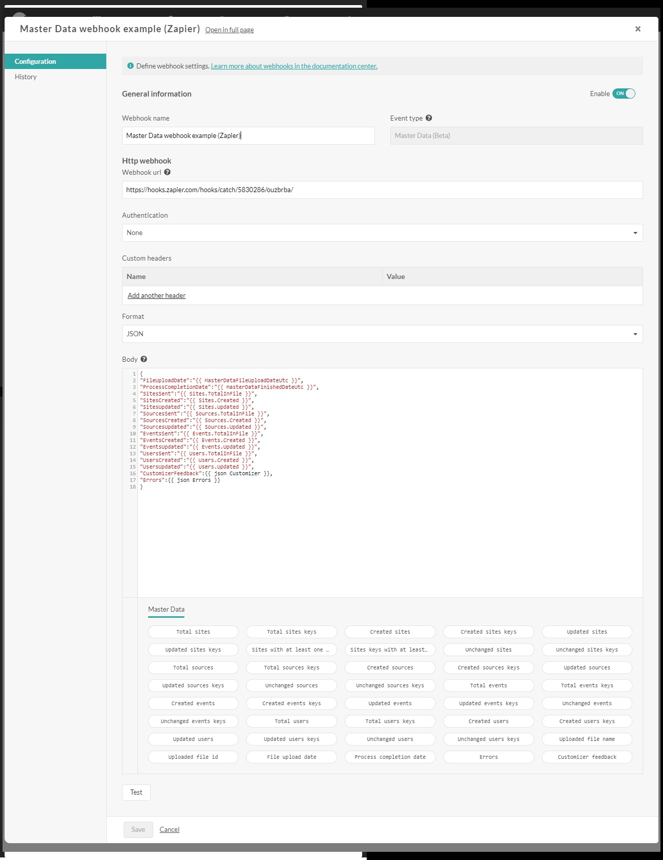 - History: shows the amount of successful and/or failed calls to the webhooks in the retention period defined on each webhooks. By default the retention period is set to 30 days. After the retention period the call history is automatically deleted. The value is a link as soon as there is effectively some history to open the history modal.