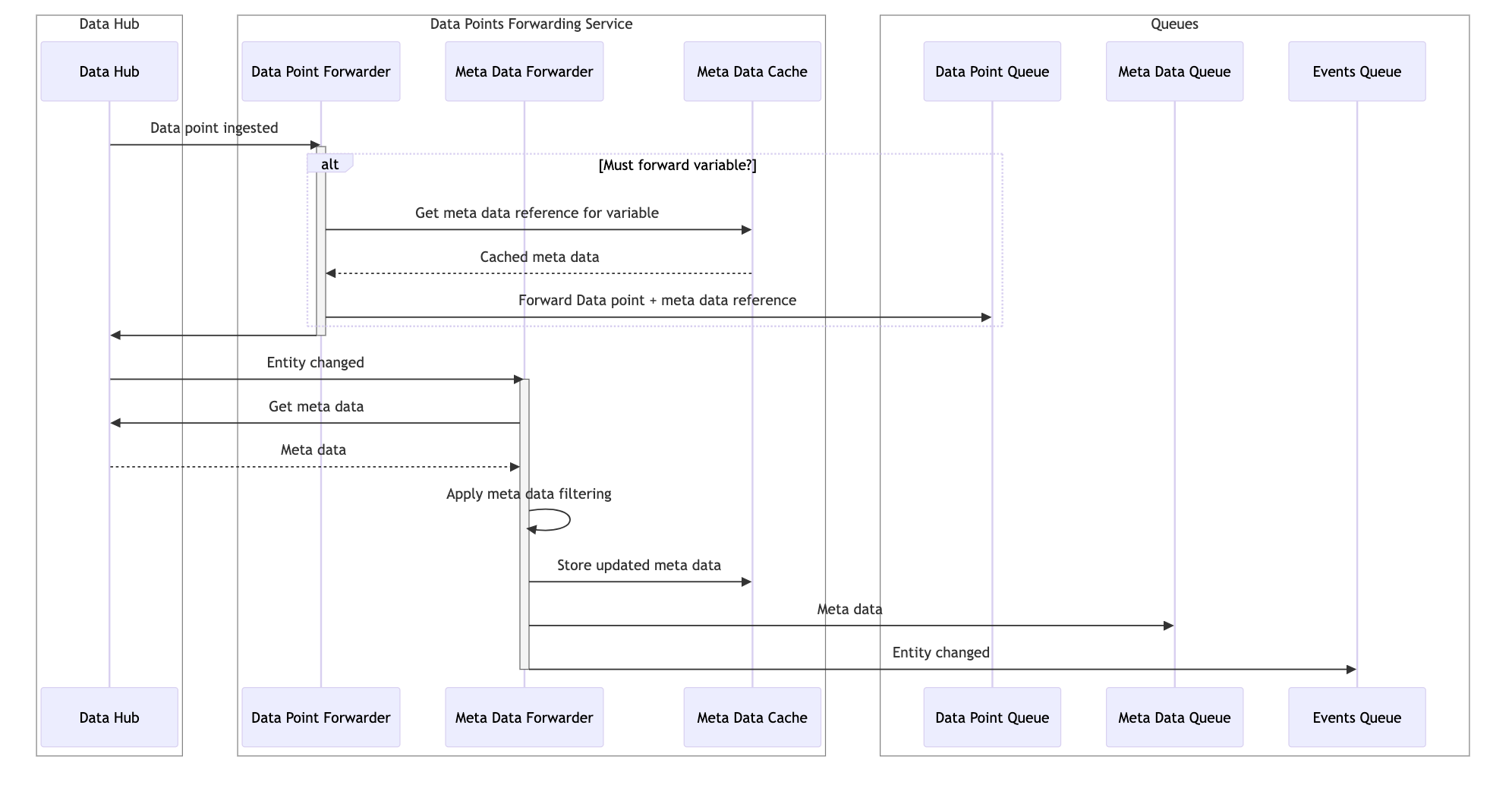 The purpose of meta data is to enrich the context of forwarded data points. The customer defines the meta data based on its needs using a Handlebars expression similar to the one used in DataHub report definition. This could potentially lead to a lot of information's to transport along with the data points. In order to keep meta data volume under control, the DataPoints Forwarding service will compute a unique meta data identifier that it will transmit along with forwarded data points. This identifier could be considered as the primary key of meta data documents stored in the MetaData queue. The use of such identifier also eases meta data change tracking: the full meta data history will flow through the meta MetaData queue. It is up to the customer to decide how to deal with the history: