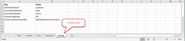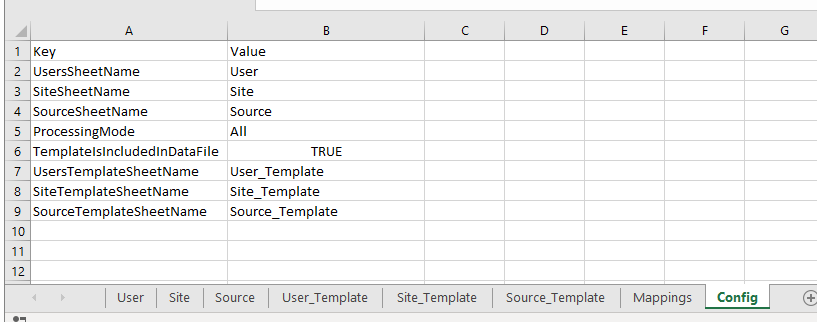 The config sheet defines some configuration elements. The sheet name must be Config and it must contain a header row with 2 columns: