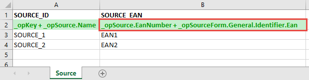 This tells MDE to store the content of column SOURCE_EAN in the ''EanNumber'' property of the source and in the source form ''General.Identifier.Ean'' when processing a Master Data Upload File.