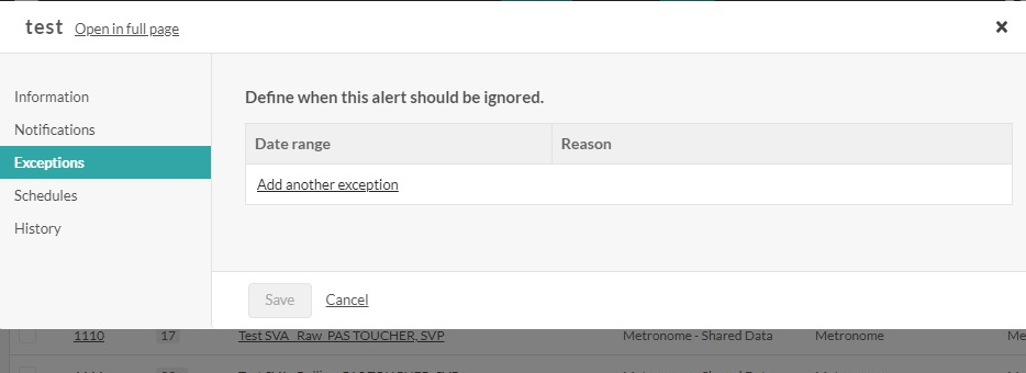 To do so, click on the alert concerned to open the 'Edit Alert Settings' window pop-up and go to the tab 'Exceptions'.